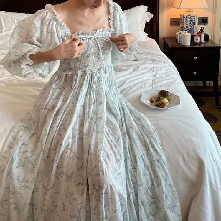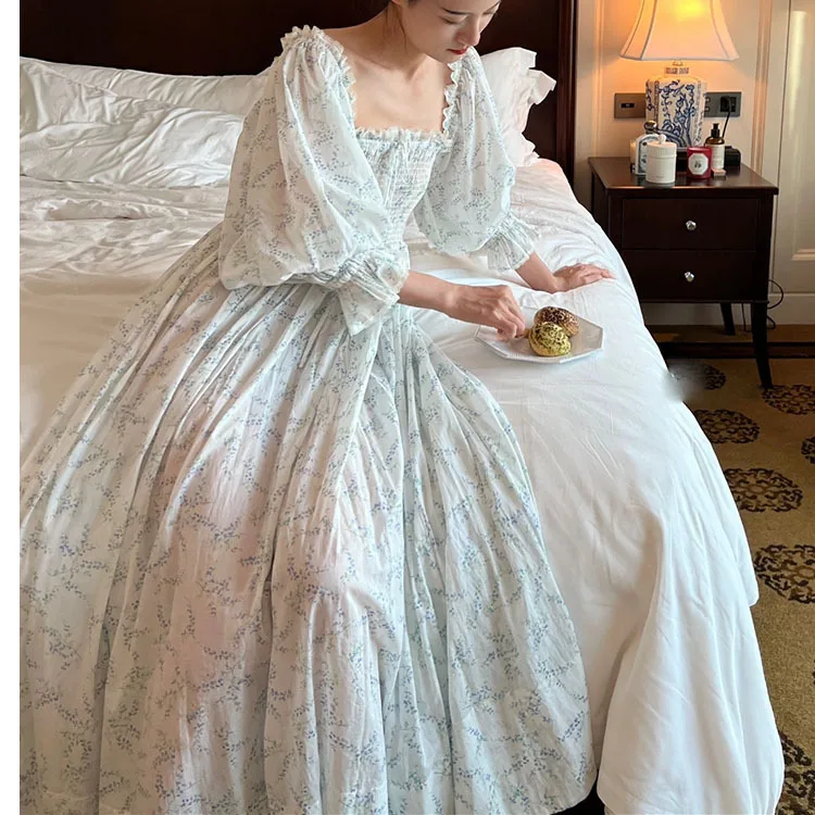100% Cotton French Fairy Printed Nightgown French Retro Girl Sweet Home Outfit Long Nightdress Women