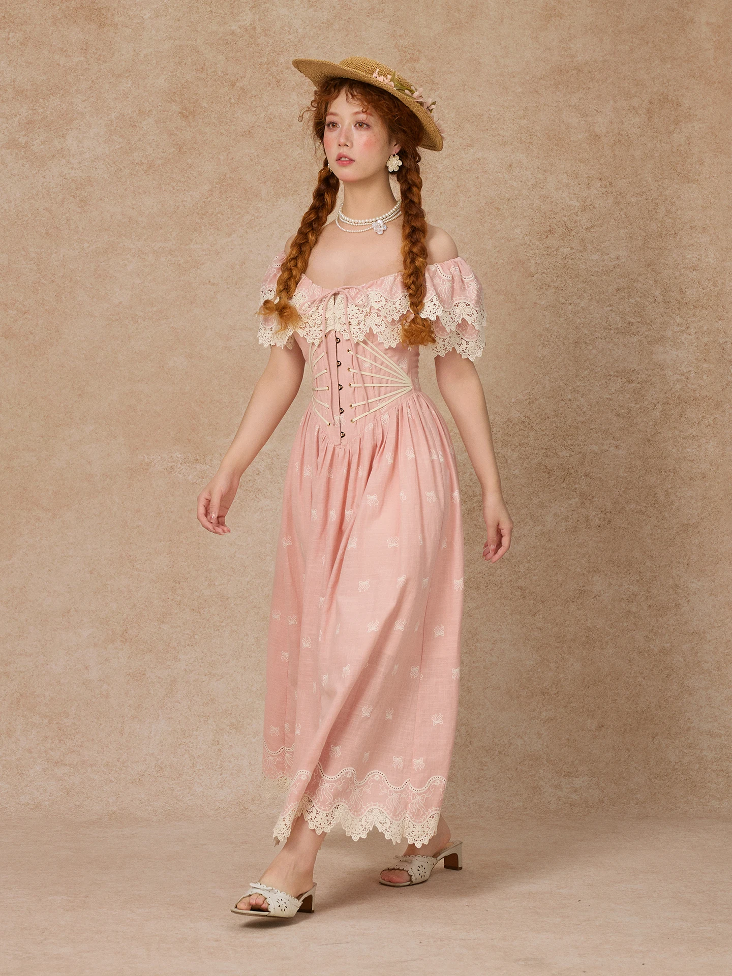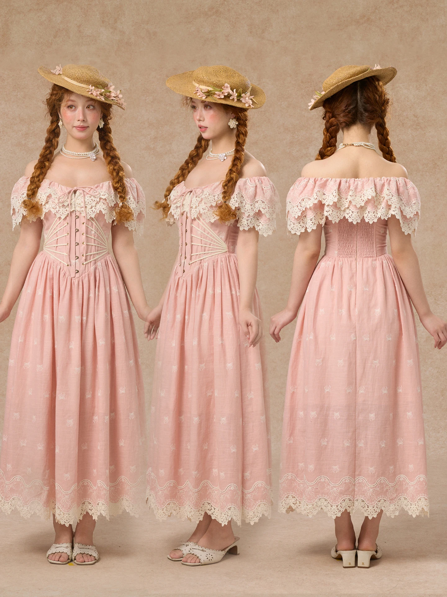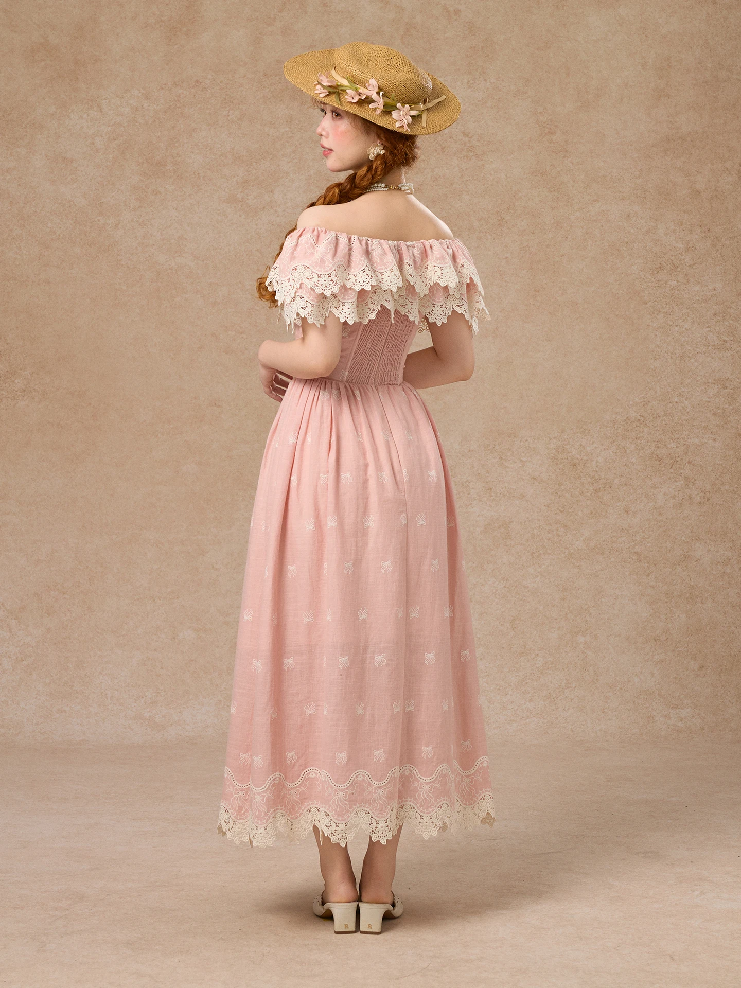 80-102cmSummer Pink Birthday Party Long Dress Women Vintage ElegantSlim Sexy Boat Neck Hollow Out Embroidery Lace Fishbone Dress