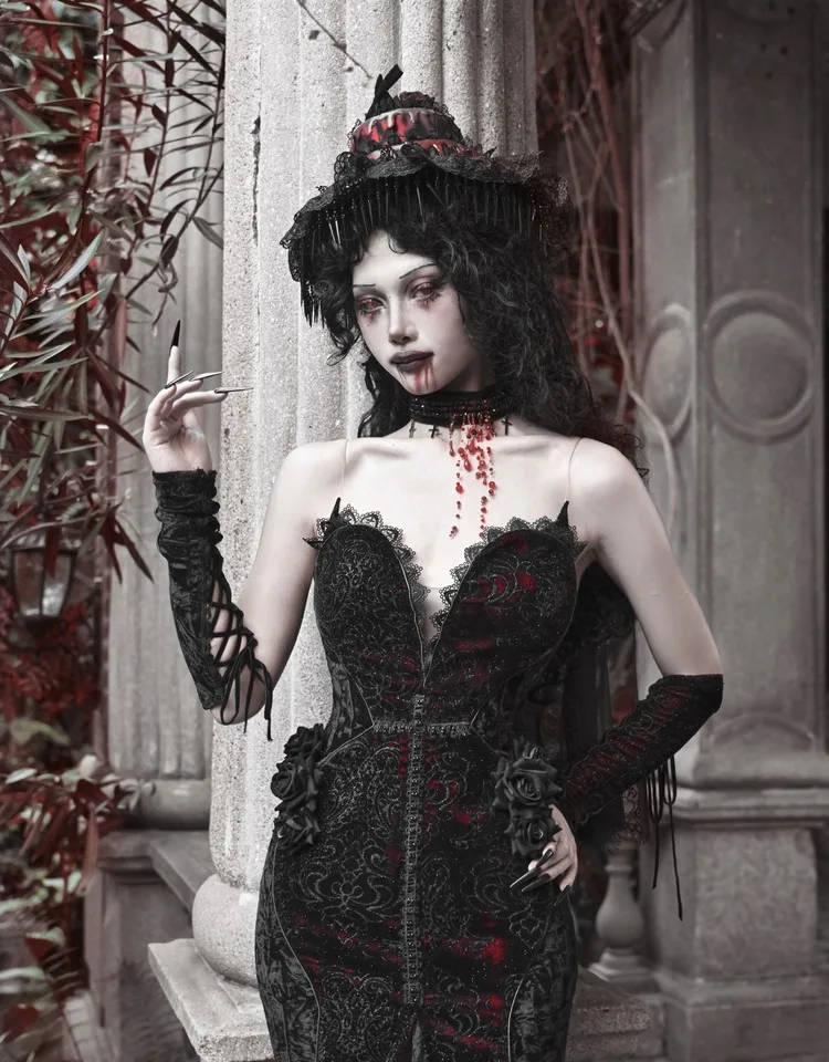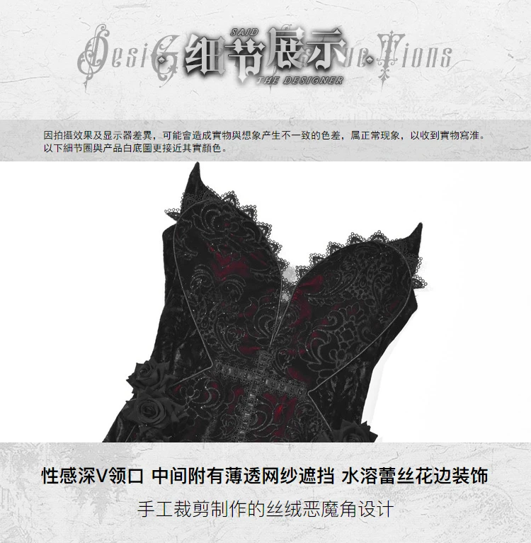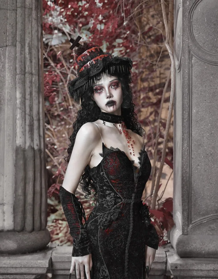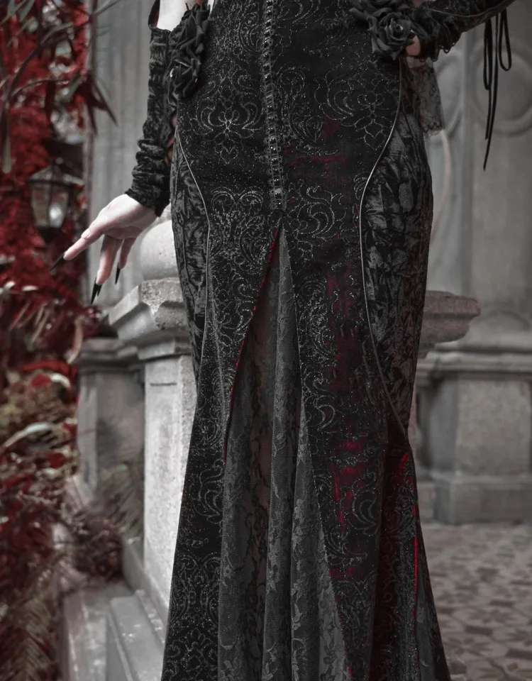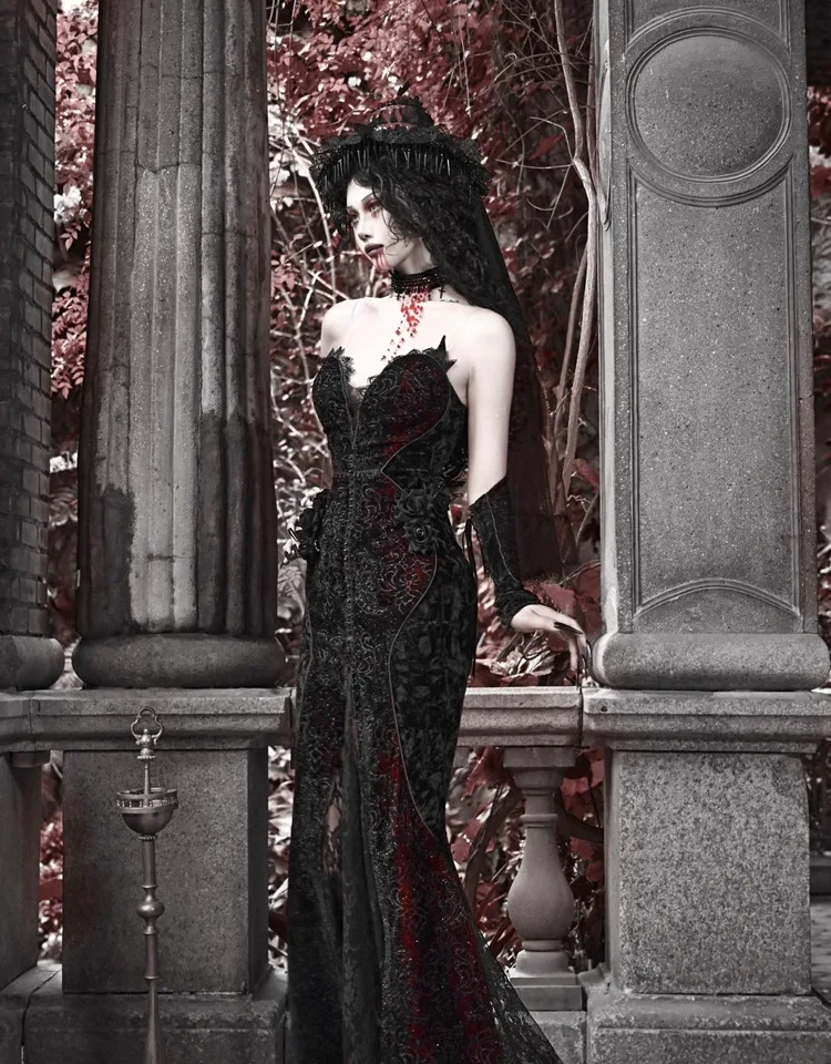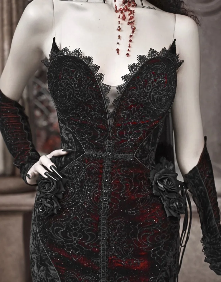 Gothica Original Design Vampire Black Red Dress Lace Patch Gothic Velvet Trumpet Sleeveless Sexy X-Long Dress Halloween