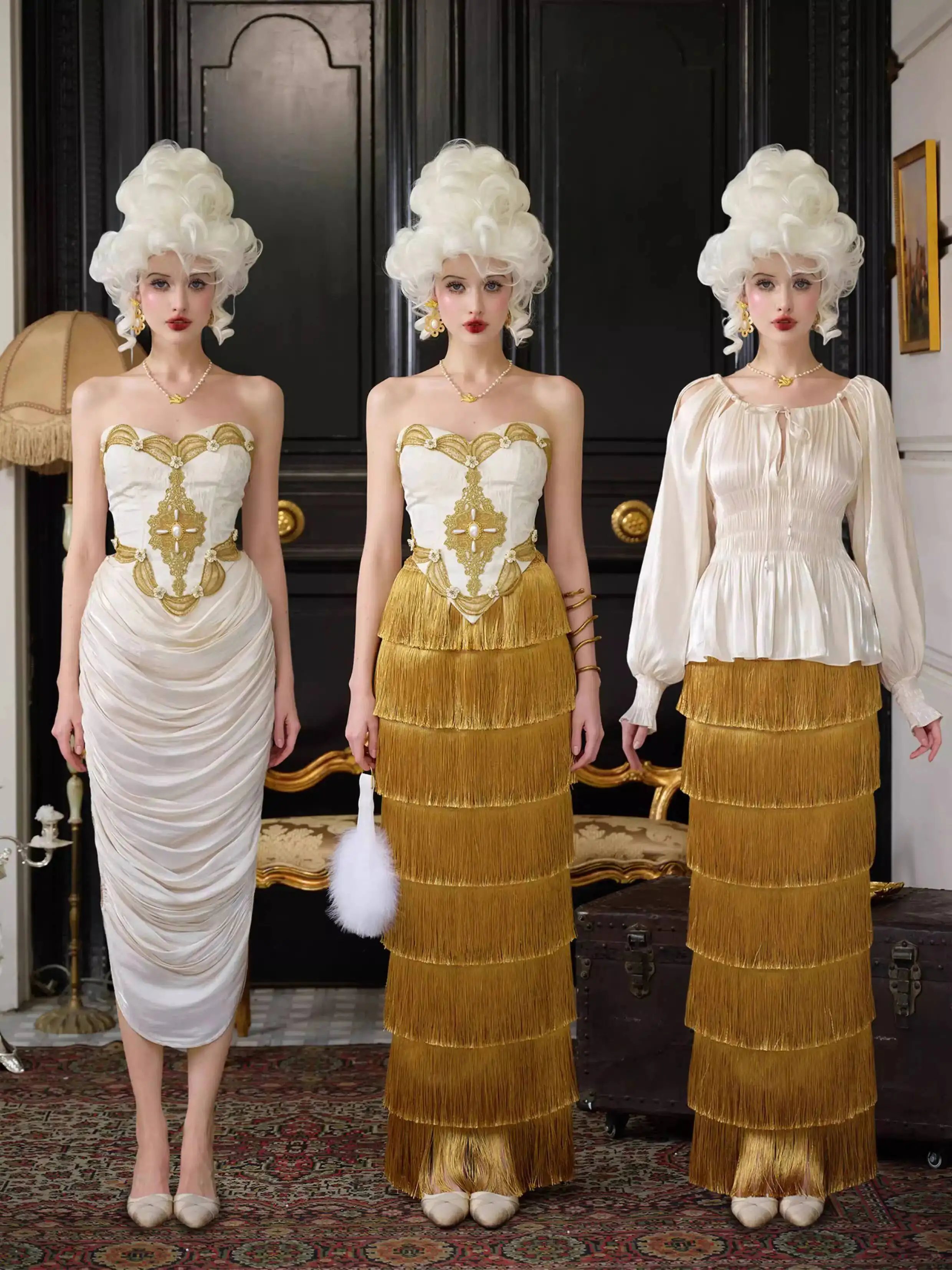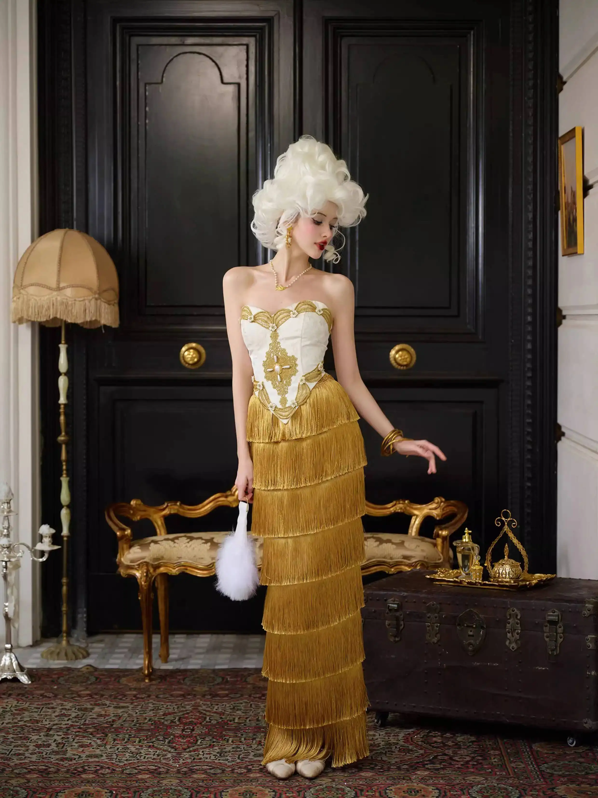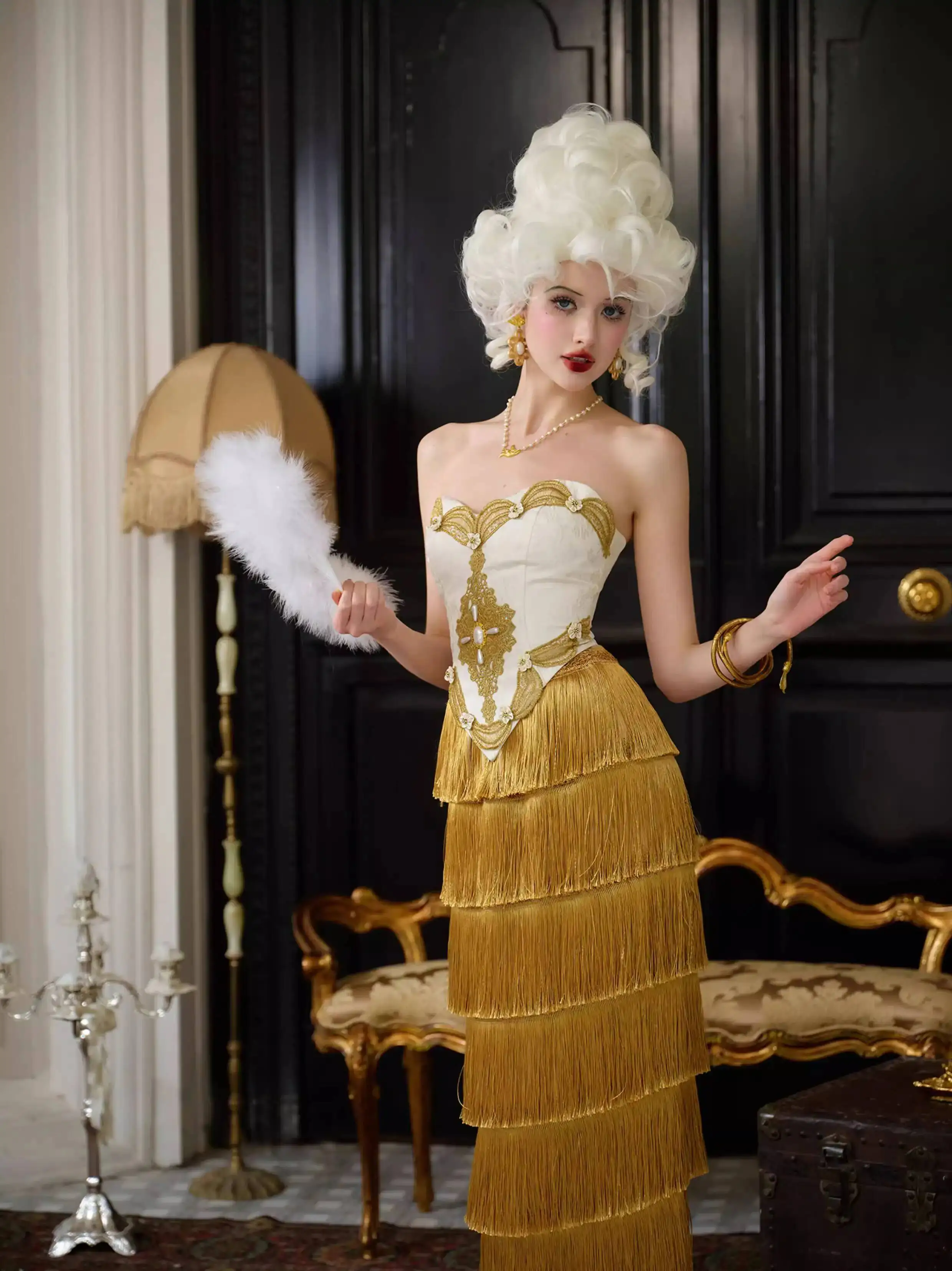 Elevate your wardrobe with this striking strapless corset dress, inspired by classic Parisian elegance. Featuring a structured corset bodice, layered silhouette, and luxurious gold tassel accents, this piece delivers dramatic sophistication for special occasions, performances, or statement-making wear. Crafted from durable polyester with meticulous construction, it combines period-inspired design with modern wearability. Perfect for those seeking refined, ornate styling with theatrical flair.