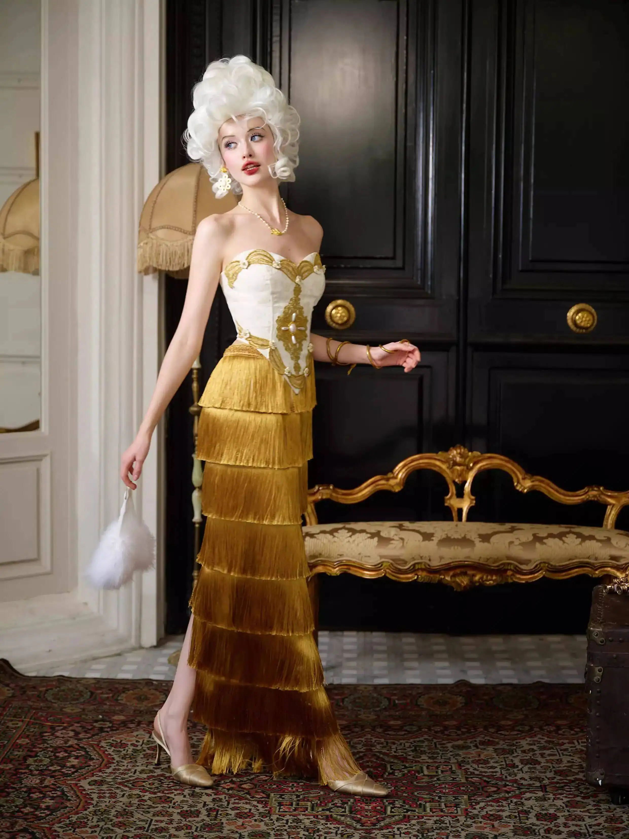Parisian Palace Style Strapless Corset Gold Tassel Layered French Dress Women Dress