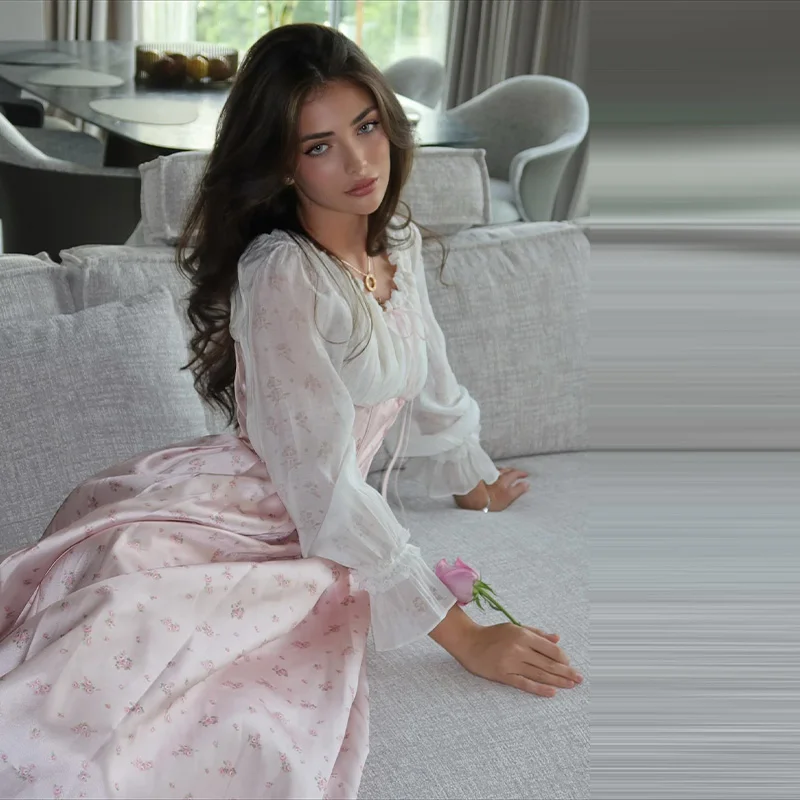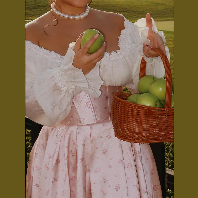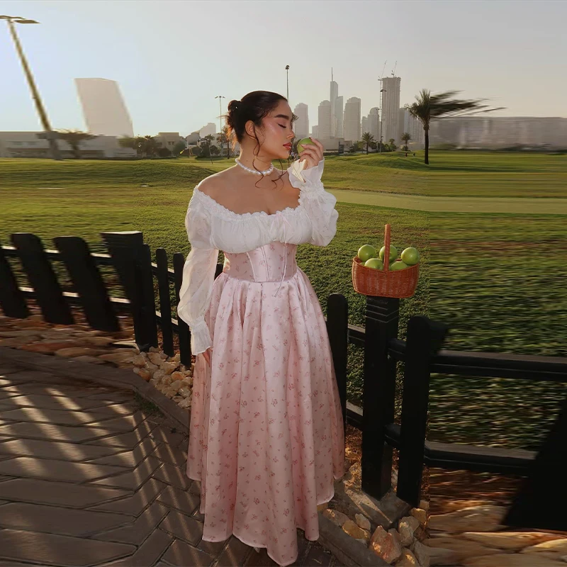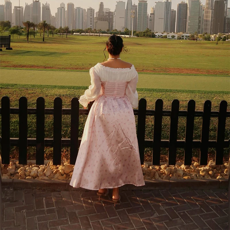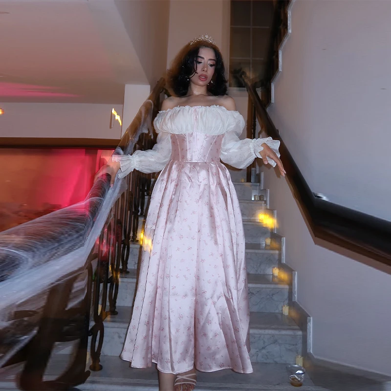 Elegant Sweet Pink Floral Print Princess Dress Off-shoulder Long Sleeve Ankle Length Prom Gown 2025 NEW Patchwork Fishbone Dress