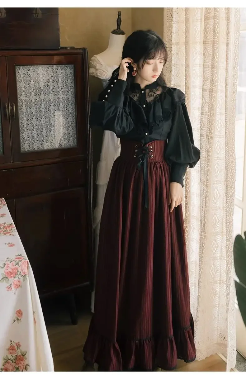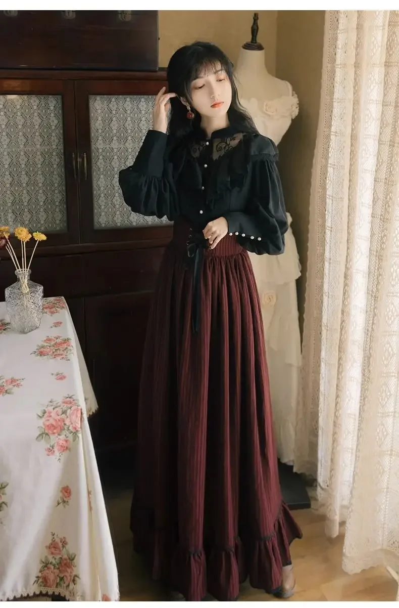French Dark Retro Long Sleeved Lace Shirt Striped Long Skirt Two-piece Dress Set