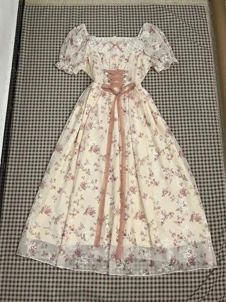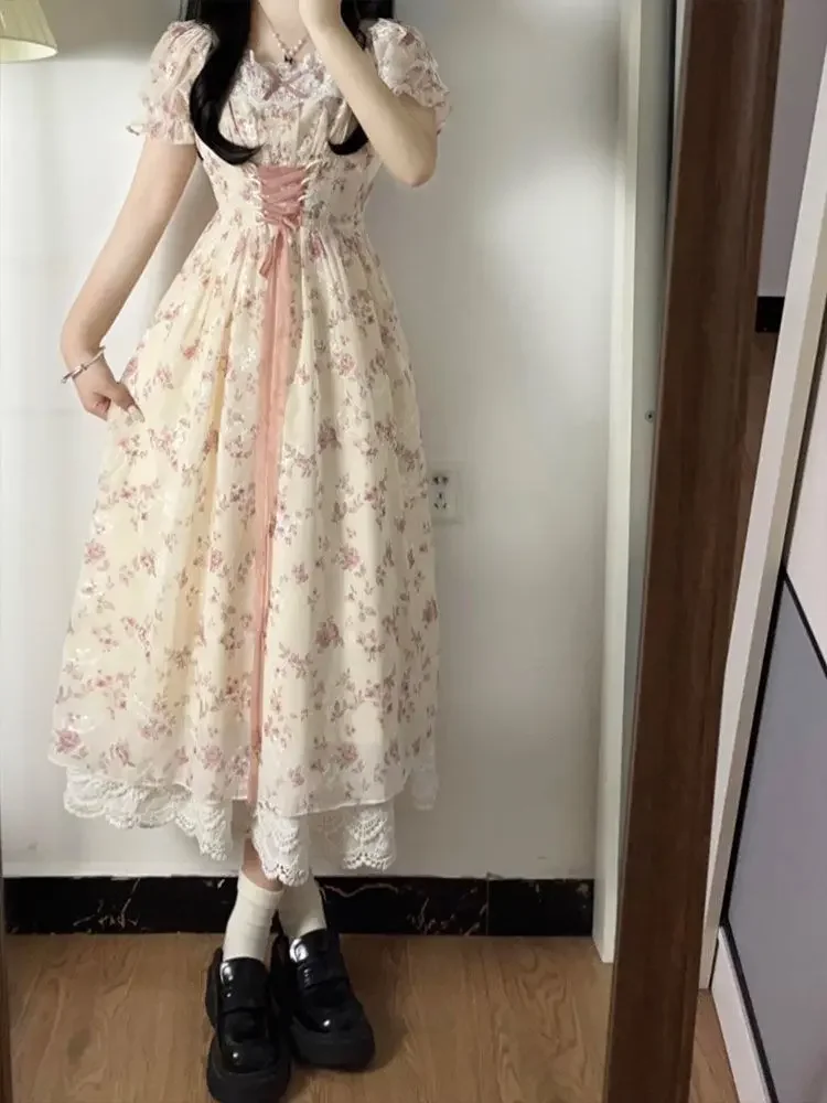 French Sweet Gentle Floral Print Dress Women's Student Summer New Belt Waist Slim Long Skirt Bubble Sleeve Short Sleeve Dress