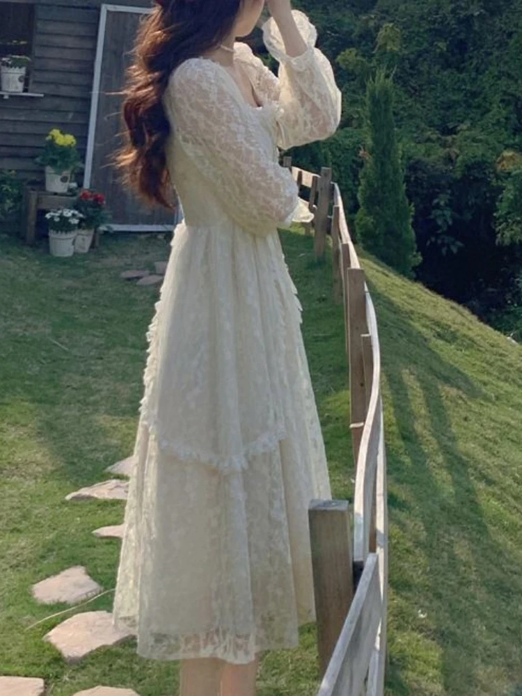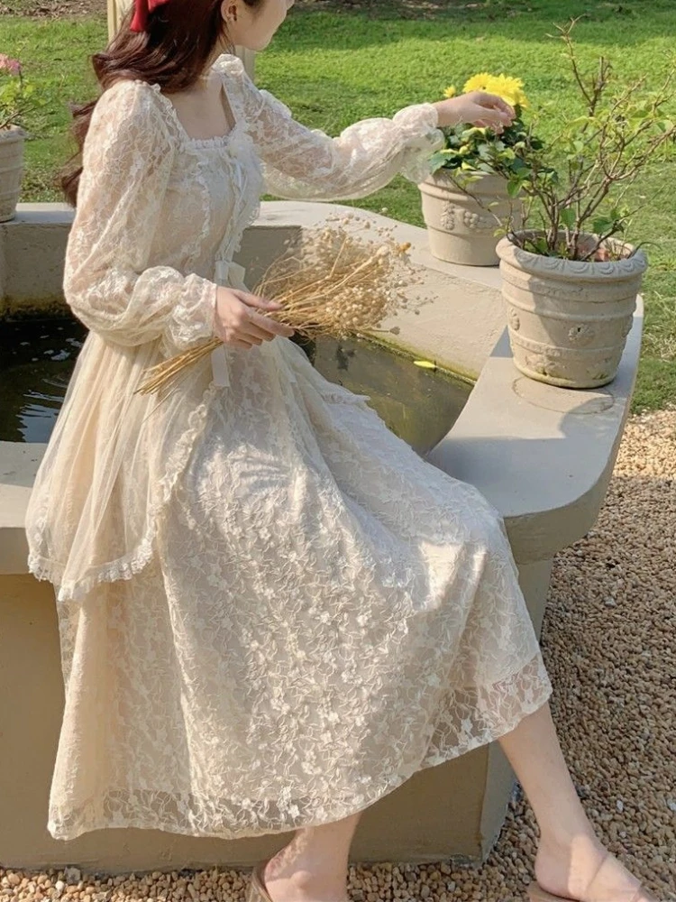 French Vintage Dress Women Summer Long Sleeve Elegant Party Midi Dress Female Casual Retro One Piece Dress Casual