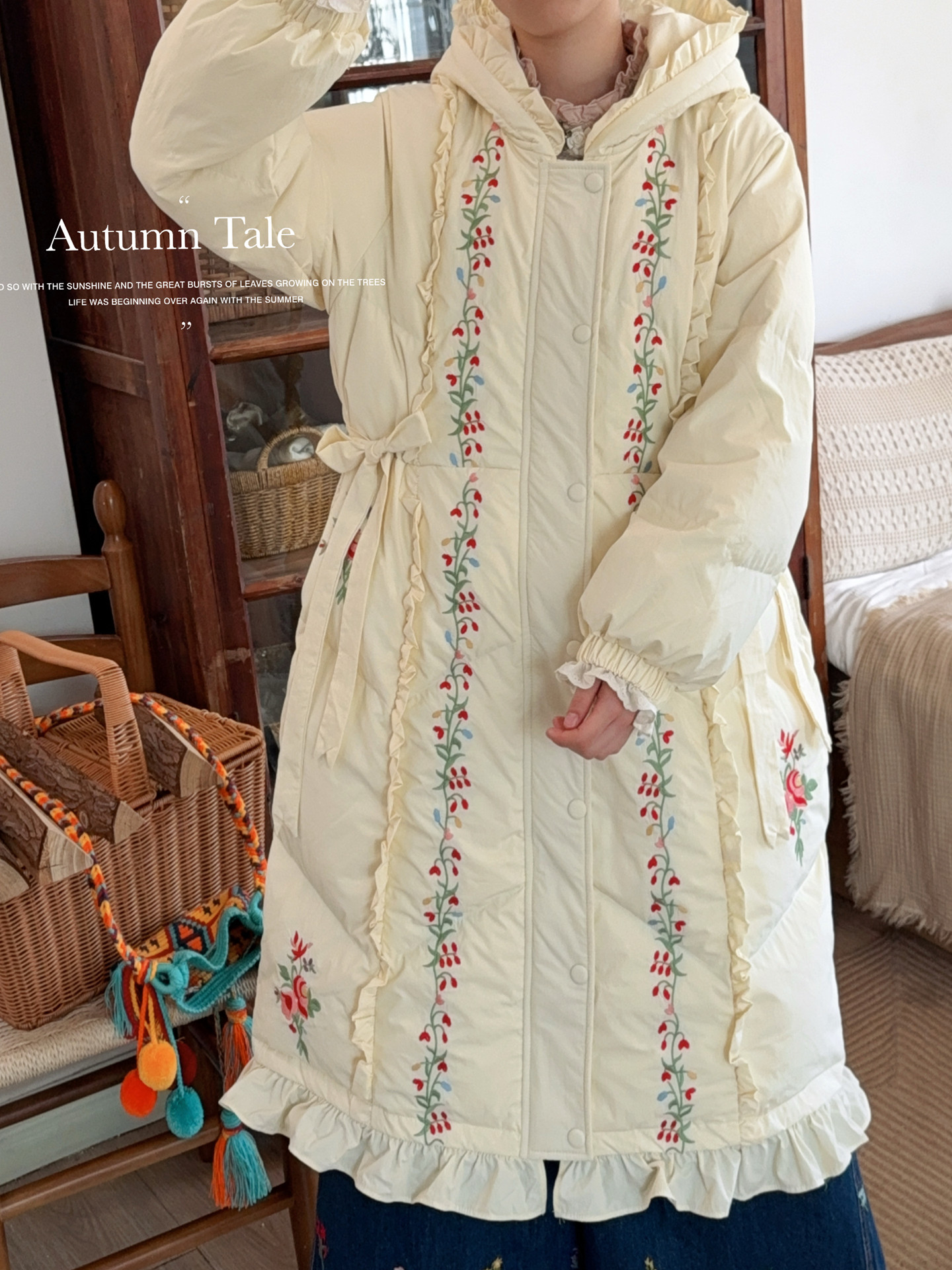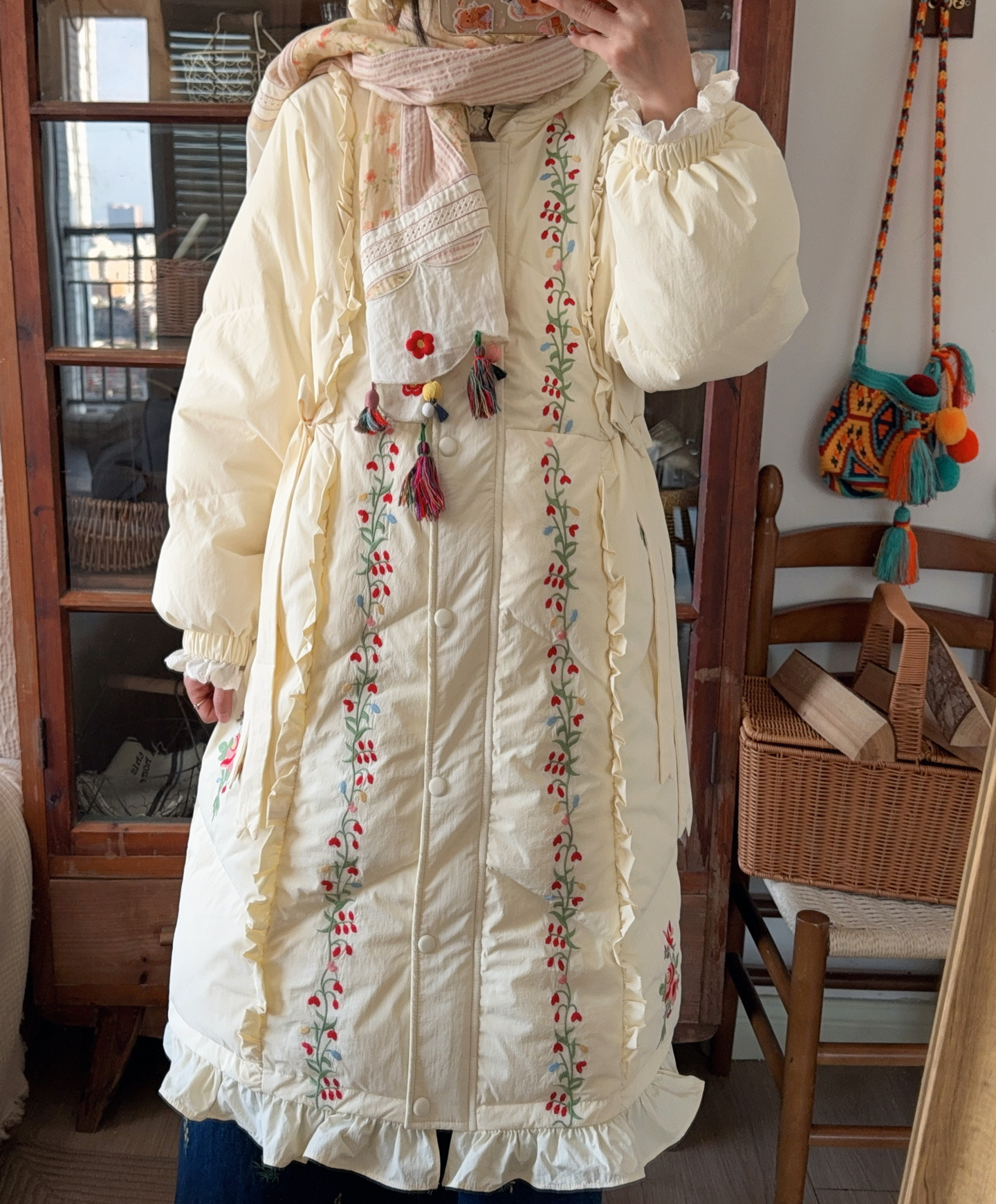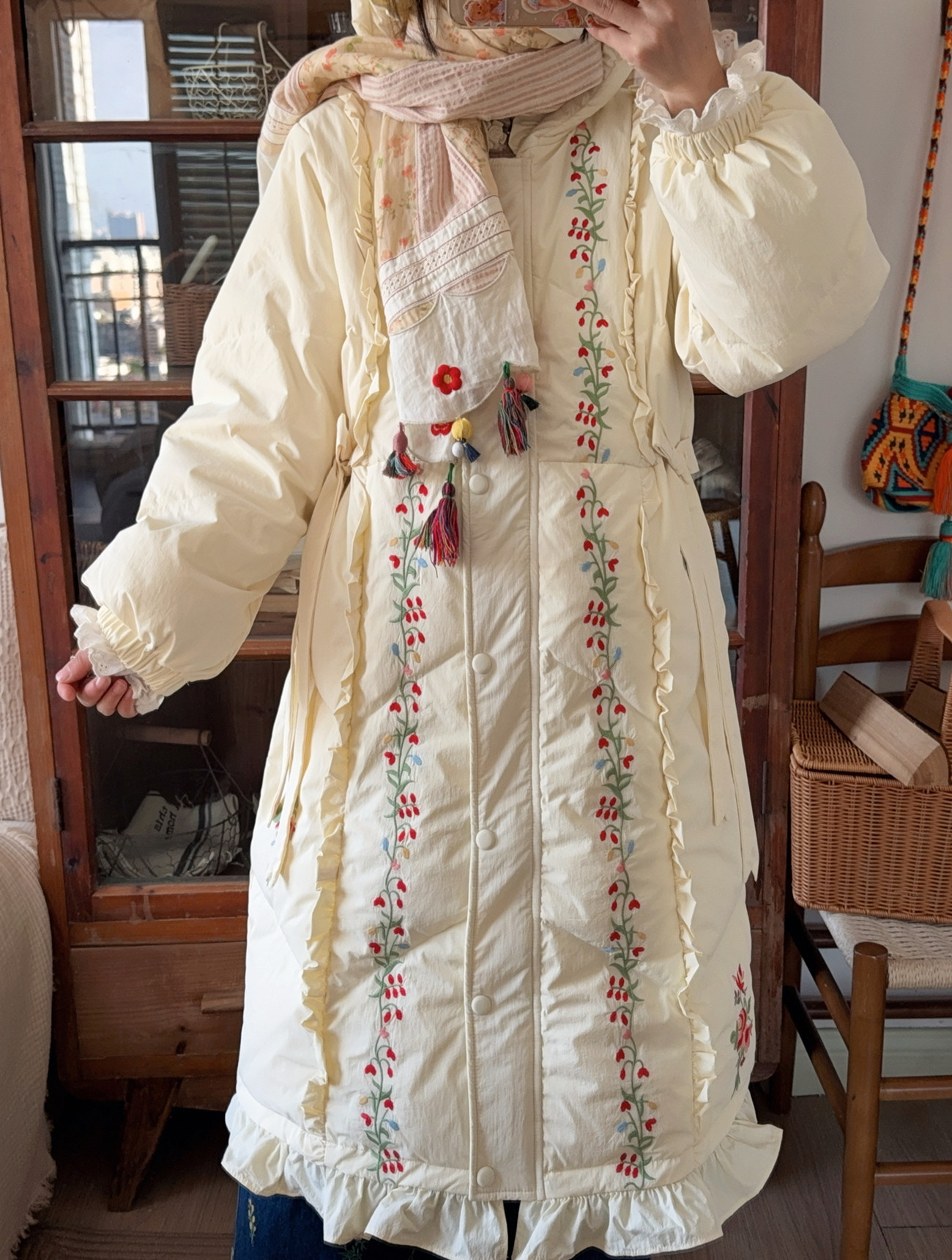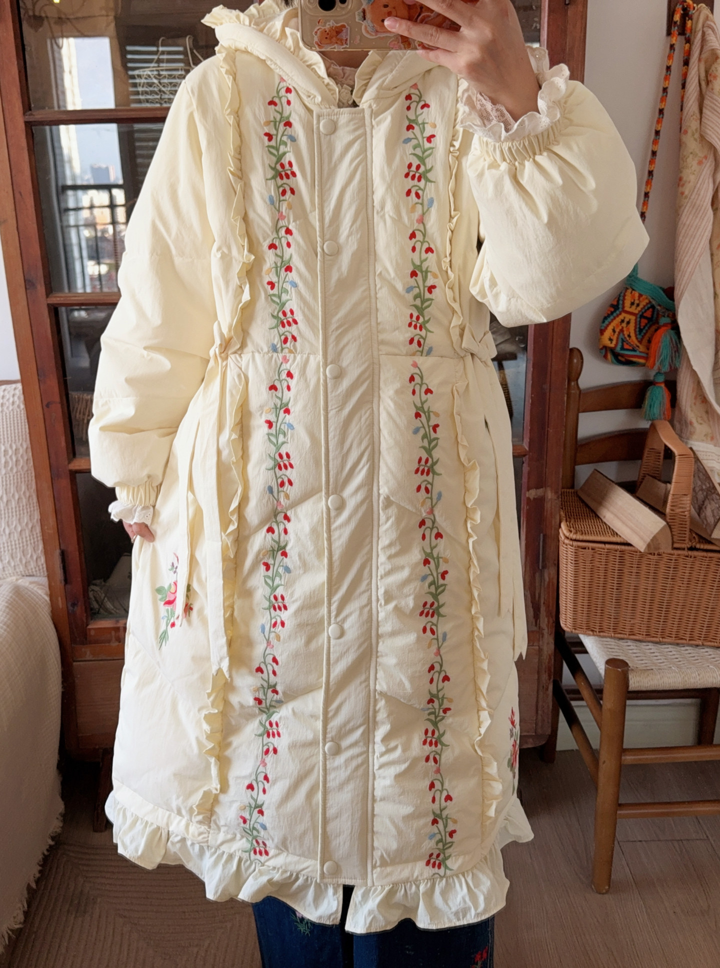 Parisian Women Full Sleeve Long Mid-Calf Thick Outerwear Hoode Zipper Down Jacket Embroidery Warm Coats Japanese Style