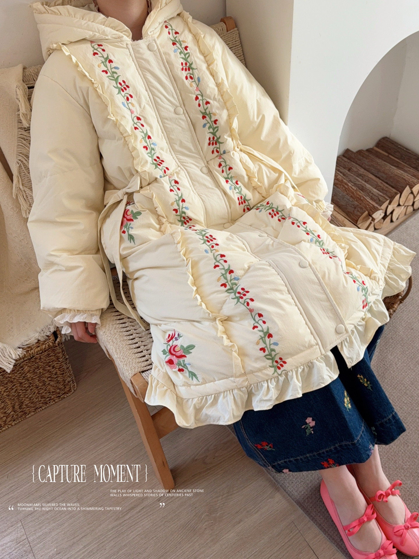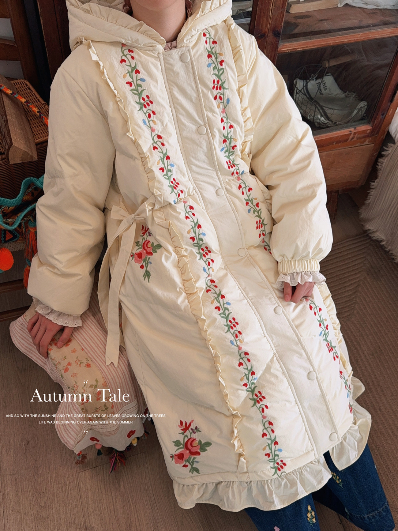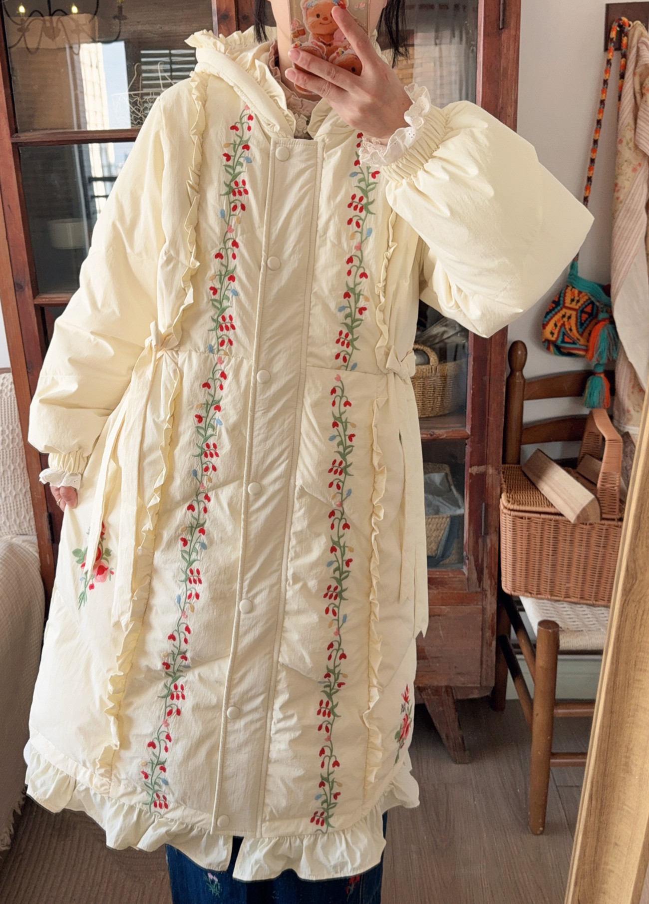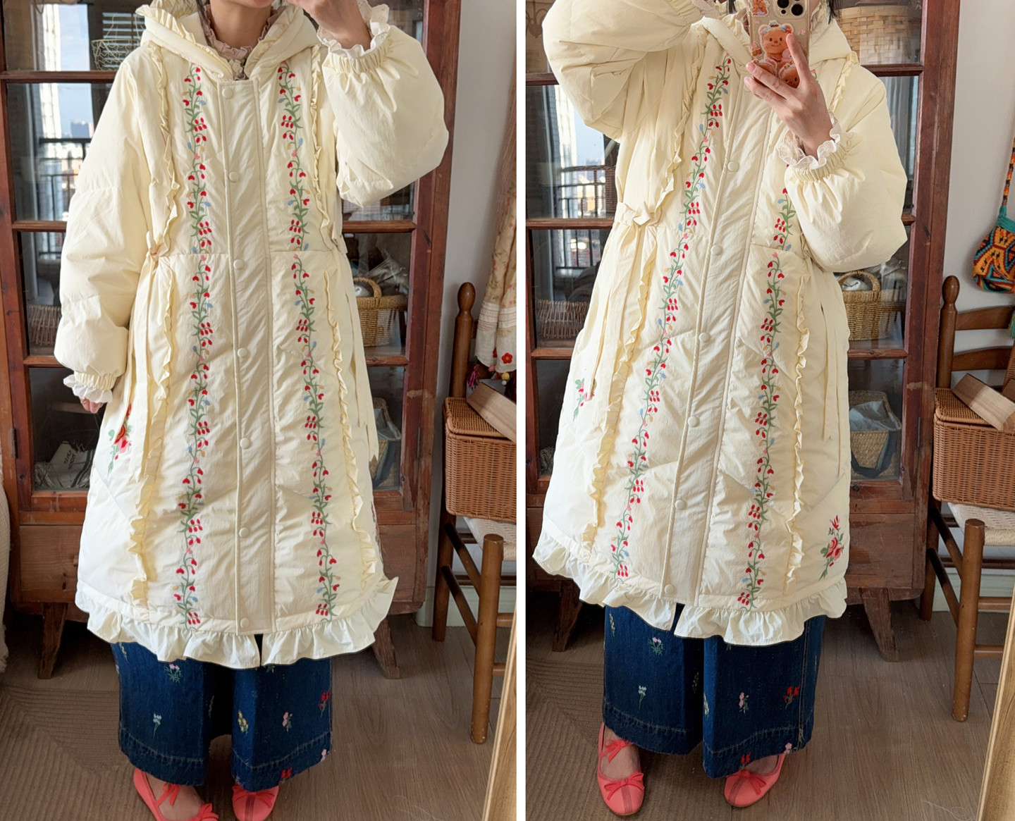 Parisian Women Full Sleeve Long Mid-Calf Thick Outerwear Hoode Zipper Down Jacket Embroidery Warm Coats Japanese Style