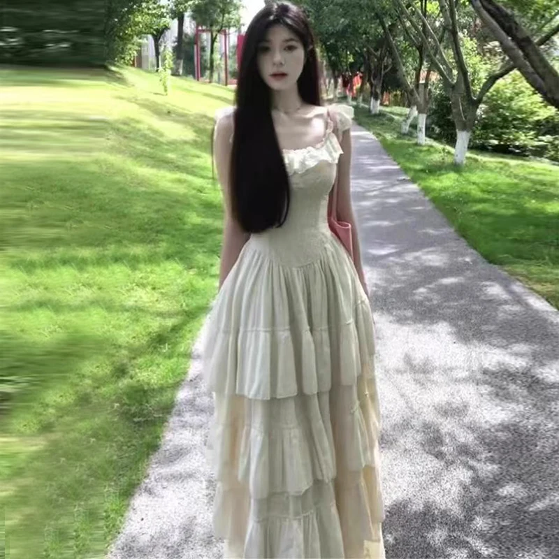 Vintage French Style Ruffles Square Collar Dress Women Summer Holiday Style Sleeveless Fairy Party Dress Fashion Female Clothes